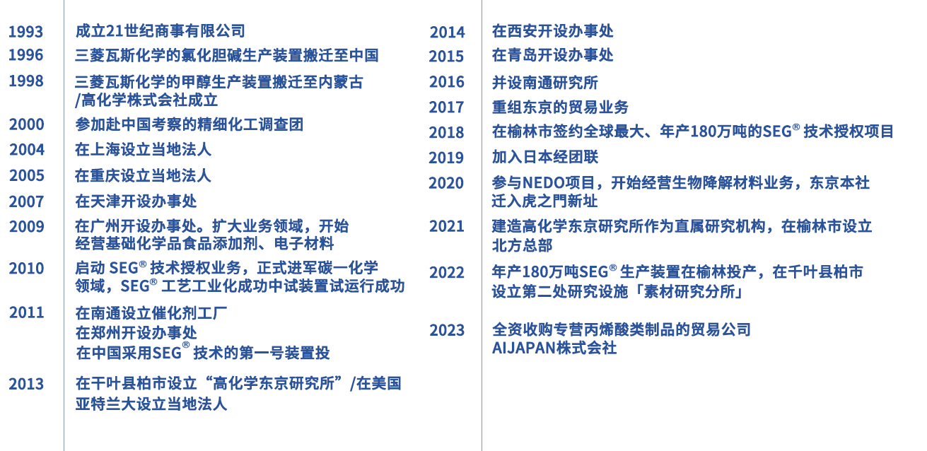 高化學(xué)株式會(huì)社前身是創(chuàng)建于1993年的日本21世紀(jì)商事有限會(huì)社,1998年注冊(cè)成立高化學(xué)株式會(huì)社,總部設(shè)在日本東京。公司成立以來,業(yè)務(wù)迅速發(fā)展擴(kuò)大,先后在中國的上海、重慶、天津、北京、廣州、江蘇,美國的亞特蘭大成立分公司或代表處。除此之外,公司還成功促成并參股了2萬噸水合肼聯(lián)產(chǎn)數(shù)萬噸ADCA發(fā)泡劑合資項(xiàng)目。